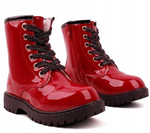 Traperki trzewiki dziecięce botki na płaskim. Śliczne botki w pięknym lustrzanym czerwonym kolorze. Zapięcie na suwak to wygoda nakładania. Do regulacji sznurowadła. Buciki mają anty poślizgową gumową podeszwę z bieżnikiem. Dobrze trzymają stopę i dopasują się do każdej nogi. Timberki posiadają ocieplenie w postaci białego kożuszka w środku.