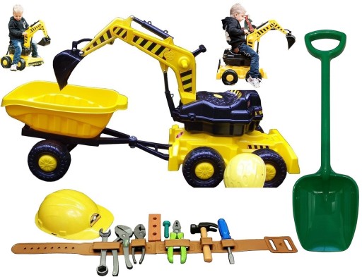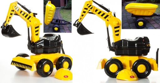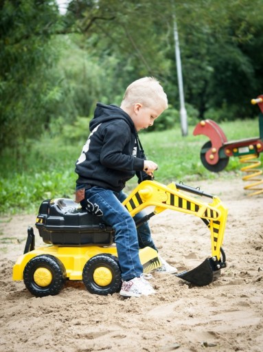 DZIECKO MOŻE STEROWAĆ RUCHOMĄ ŁYŻKĄ KOPARKI, OBRACAĆ SIĘ NA OBROTOWYM SIEDZISKU NAWET O 360 STOPNI, ORAZ PORUSZAĆ CAŁYM ZESTAWEM DO PRZODU I DO TYŁU ODPYCHAJĄC SIĘ NOGAMI !
