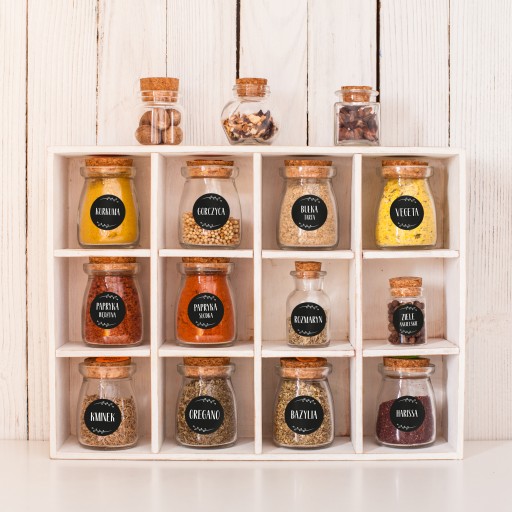 W zestawie znajduje się 194 już zadrukowanych naklejek z nazwami większości przypraw.