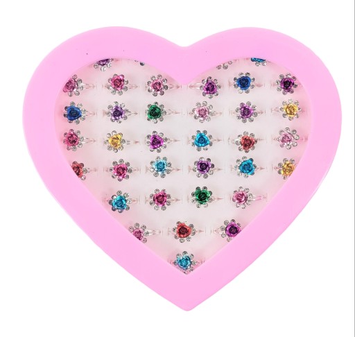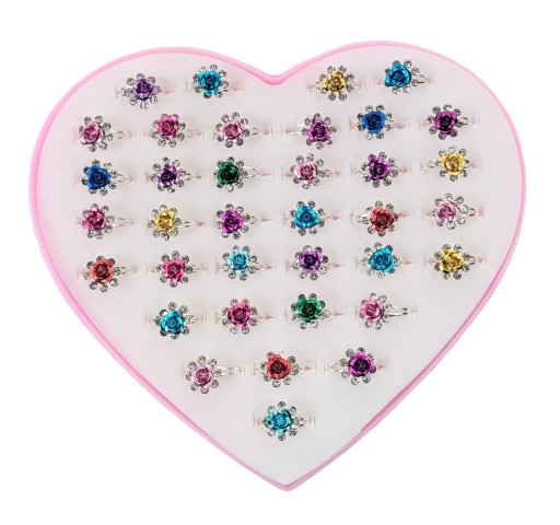- 36 pierścionków z błyszczącymi elementami umieszczono w pudełeczku w kształcie serca.
