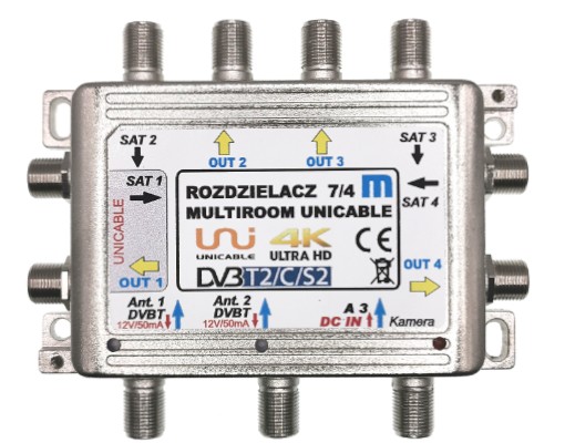 Rozdzielacz 7/4 Multiroom Unicable przeznaczony jest do budowy instalacji rozdziału sygnałów TV SAT i TV naziemnej DVBT do 4 niezależnych punktów (gniazd). Dodatkowe gniazda można podłączyć stosując pasywne rozdzielacze ½, ¼. Dedykowany jest do usługi Multiroom z wykorzystaniem konwerterów typu Unicable. Rozdzielacz umożliwia zsumowanie sygnałów z konwertera SAT , 2 x anteny tv naziemnej DVBT i ewentualnie anteny radiowej. Wszystkie sygnały przesyłane są do poszczególnych gniazd poprzez pojedynczy przewód koncentryczny 75 ohm. Rozdzielacz umożliwia odbiór sygnałów w technologii 4K ultra HD i przesyłanie komend Unicable i DiSeqc.