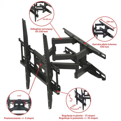 Podwójne ramię gwarantujące stabilność i bezpieczeństwo. Szeroki zakres regulacji zarówno w pionie jak i w poziomie oraz dopasowanie właściwej odległości od ściany. Poziomica ułatwiająca równe zainstalowanie uchwytu.