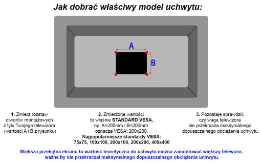 Rozmiar TV 23-60", waga telewizora do 45kg, standard VESA 100x100, 200x200, 300x200, 300x300, 400x300, 400x400.