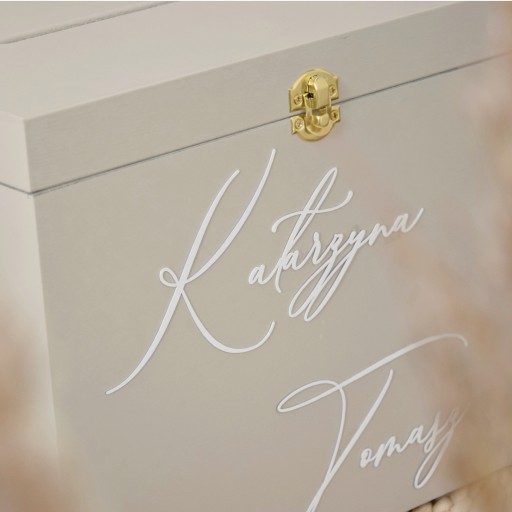 Pudełko na koperty to nieodłączny element każdego wesela. Szczególną wartość ma jednak ta, która jest przypisana danej parze, ma subtelny biały i elegancki napis.