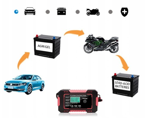 Odpowiedni do akumulatorów kwasowo-ołowiowych i AGM o pojemnościach 10-100 Ah, nie nadaje się akumulatorów litowych.