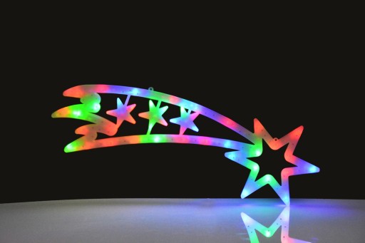 Ozdobna duża kometa z kolorowymi diodami LED świecąca w różnych kolorach. Posiada dwa zaczepy ułatwiające montaż. Cała wykonana jest z białego plastiku w środku z lampkami LED.