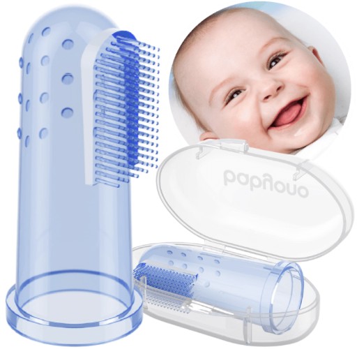 Najlepszym rozwiązaniem i pomocą przy codziennej higienie jest szczoteczka do pierwszych ząbków - specjalna nakładka na palec rodzica.