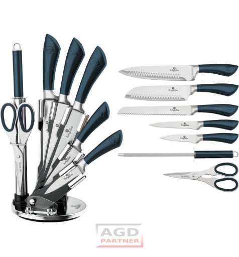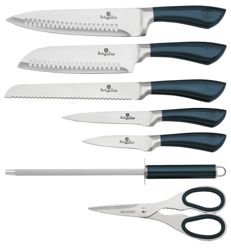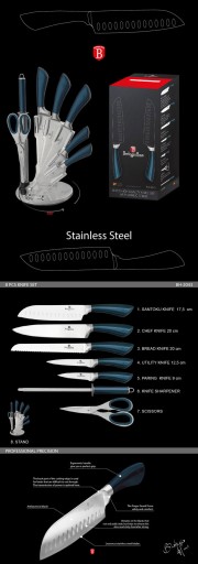 8 elementowy zestaw noży na stojaku firmy BERLINGER HAUS z serii AQUAMARINE.Przeznaczone do porcjowania mięsa i ryb, krojenia pieczywa oraz obierania i siekania warzyw. Noże wykonane wysokiej jakości stali nierdzewnej Ferrinox 18/10 o wysokiej zawartości węgla 1.4028/X30Cr13. Istotną cechą tej stali jest fakt, że jest odporna na wszelkiego rodzaju zadrapania, zarysowania, charakteryzuje się zwiększoną odpornością na ścieranie i korozję. Ostrze wykonane ze stali chromowo- molibdenowej, wyjątkowo twardej, odpornej na odkształcenia, podatnej na ostrzenie. Nóż został wykonany zgodnie z tradycyjną sztuką z jednego kawałka stali. Przejście między ostrzem i rączką jest bezszwowe. Uchwyty są ergonomiczne formowane i umożliwiają bezpieczne trzymanie bez poślizgu.
