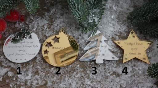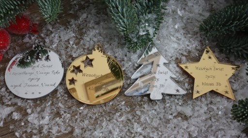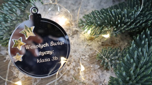 Przepiękne lustrzane bombki z twoim grawerem, razem z woreczkiem celofanowym i wstążką. Grawer na najwyższej jakości sprzęcie - nie blaknie, nie ściera się.
