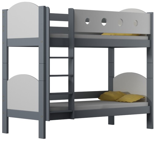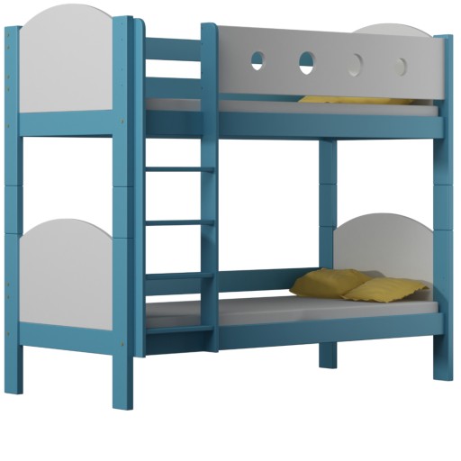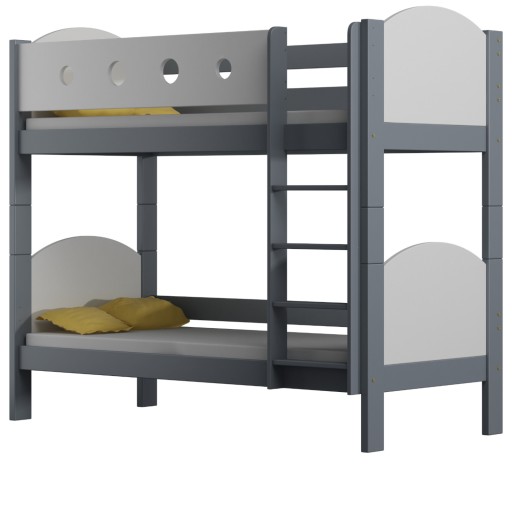 URWISEK L to łóżko piętrowe, które można rozłożyć na dwa niezależne łóżeczka. Wykonane zostało z wysokiej jakości drewna sosnowego, połączonego z wytrzymałą płytą meblową w zagłówkach i górnej barierce. Montowana z prawej, bądź lewej strony łóżka drabinka, posiada płaskie, wygodne szczebelki, natomiast krawędzie drewnianej konstrukcji mają zaokrąglone kształty. Charakterystyczną cechą tego modelu są gładkie, łukowate zagłówki oraz boczna barierka górna, zdobiona wyciętymi kołami.