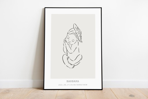 To obraz do pokoju dziecka przedstawiający piękny rysunek noworodka. Zawiera imię dziecka, datę i godzinę urodzenia, wagę oraz wzrost. Grafika dla dzieci przygotowana jest w rozmiarze a3 - 29,7x42cm.