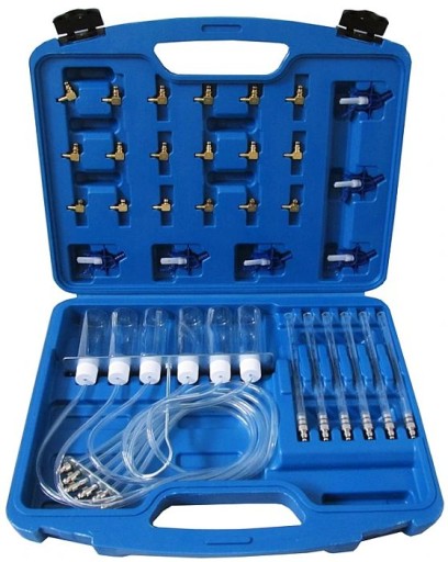 - Zestaw przystosowany do szybkiego i efektywnego pomiaru objętości paliwa na przelewie każdego wtryskiwacza. Umożliwia jednoczesny pomiar na 6 wtryskiwaczach.