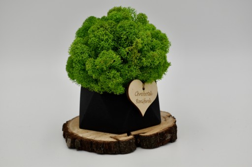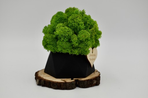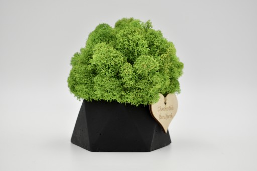 ( 10cm x 10cm x 5cm wymiary doniczki bez mchu, + ok. 5/6 cm mechu) z najwyższej jakości zielonego wiosennego, gęstego i naturalnie impregnowanego fińskiego mchu chrobotek reniferowy. Doniczka betonowa ( czarna) jest bardzo wyrazistym elementem każdego wnętrza. Produkt ten doskonale wpisuje się szczególnie w nowoczesny styl. Zawdzięcza to oryginalnemu kształtowi geometrycznemu. Kolor czarny będzie dobrze prezentował się w nowoczesnych wnętrzach. Doniczka ręcznie wykonana.