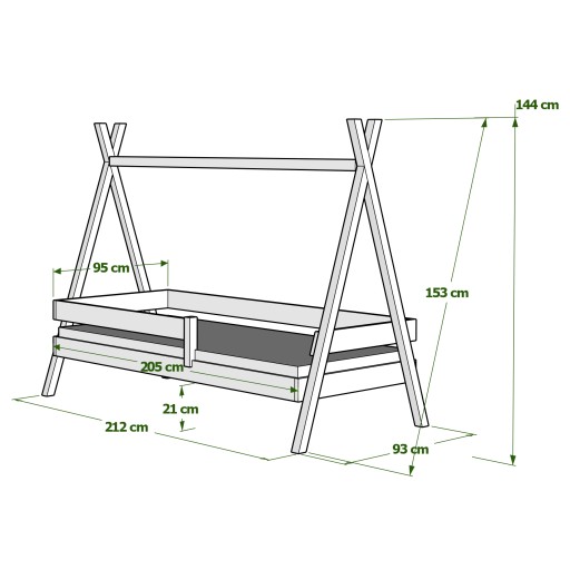 Z TIPI PLUS nie ma czasu na nudę! Prezentowany model to pojedyncze łóżko dziecięce, w całości wykonane z drewna sosnowego. To wyjątkowe łóżko przystosowane jest do zamontowania szuflady w celu przechowywania pod łóżkiem pościeli, książek, czy gier. Jego konstrukcja nawiązuje do Wigwamu, zachęcając do zabawy w stylu indiańskim. Konstrukcja daje możliwość ozdobienia go dodatkami, które spersonalizują wygląd i uczynią go wyjątkowym. TIPI PLUS zachęca do puszczenia wodzy fantazji!