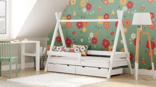 Z TIPI PLUS nie ma czasu na nudę! Prezentowany model to pojedyncze łóżko dziecięce, w całości wykonane z drewna sosnowego. To wyjątkowe łóżko przystosowane jest do zamontowania szuflady w celu przechowywania pod łóżkiem pościeli, książek, czy gier. Jego konstrukcja nawiązuje do Wigwamu, zachęcając do zabawy w stylu indiańskim. Konstrukcja daje możliwość ozdobienia go dodatkami, które spersonalizują wygląd i uczynią go wyjątkowym. TIPI PLUS zachęca do puszczenia wodzy fantazji!