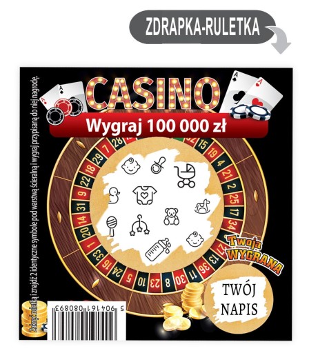 Uwaga: W przypadku braku informacji, wzór zdrapki wybierzemy losowo. Pole "Twój napis" pozostawimy puste a naklejkę zdrapkę dodamy luzem. Będziesz miał możliwość wpisania treści np. długopisem.