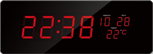 Zegar posiada duży, cyfrowy wyświetlacz w kolorze czerwonym.