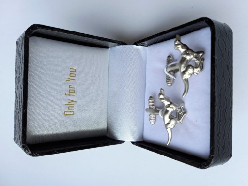 - Spinki są zapakowana w ekskluzywne etui z wzorem skóry węża o wymiarach ok. 70x70x40 mm.