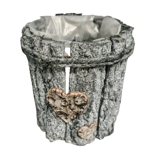 Osłonka w stonowanym kolorze, surowym wykończeniu, zdobiona motywem serca. Stanowi idealną dekorację parapetu, ogrodu, tarasu.
