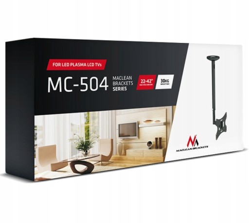 Uchwyt do telewizora model Maclean MC-504A B, który umożliwa zawieszenie telewizora o przekątnej ekeanu od 23 do 42" i wadze nie przekraczającej 30 kg. na suficie. Uchwyt Maclean MC-504A umożliwia na regulację położenia telewizora w pionie + / - 15st i dookoła własnej osi (360 stopni) w poziomie. Uchwyt wykonany jest z wysokiej jakości metalu. Kolor czarny.