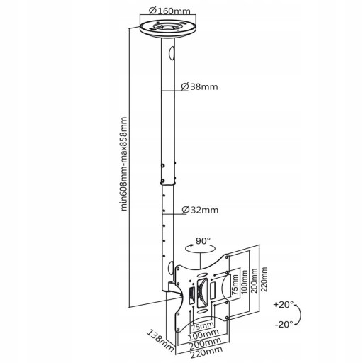 ПОТОЛОЧНЫЙ КРОНШТЕЙН ДЛЯ ТВ-МОНИТОРА 23–42 фута, 30 кг
