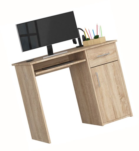 Z pewnością słyszałeś o tym, że otoczenie wpływa na Twoje samopoczucie wciągu całego dnia. Tworzą je osoby, z którymi przebywasz, zwierzęta, rośliny a także przedmioty jakie masz w zasięgu swoich rąk. Jeżeli chodzi o różne rzeczy istotna jest przede wszystkim ich kolorystyka, ergonomia, wymiary, funkcjonalność zaprojektowana z myślą o Twoich potrzebach. Prezentowane przez nas biurko to uniwersalna kolorystyka pasująca do wielu wnętrz i aranżacji i optymalne wymiary adekwatne dla osób w różnym wieku. Jest to przede wszystkim mebel, dzięki któremu zadbasz o właściwą organizację pomieszczenia porządkując książki, notatki i inne akcesoria biurowe. Komfortowym elementem tego mebla jest także wysuwana szuflada na klawiaturę, która została zamontowana na solidnych i wytrzymałych metalowych prowadnicach rolkowych. Ponadto udogodnieniem użytkowym jak i subtelną dekoracją będą srebrne uchwyty o wygodnym kształcie sprzyjającym podczas korzystania z szafki lub szuflady. Mebel o takich cechach posłuży jako niezbędnik dla najmłodszych, młodzieży jak i osób dorosłych. Sprawdzi się wśród wnętrz domowych takich jak: pokój dziecięcy, młodzieżowy i gabinet a także we wnętrzach komercyjnych takich jak biura pracownicze, lokale usługowe oraz szkoły.