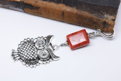 Elegancka zakładka do książki z zawieszką w kształcie sowy z dodatkiem koralowca i srebrnego hematytu.