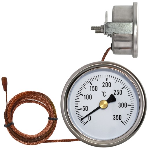 Termometr tarczowy do pomiaru temperatury cieczy, gazów i ciał stałych. Pomiar temperatury dokonywany jest przez głowicę pomiarową na końcu rurki kapilarnej. Zasada pomiaru opiera się na wykorzystaniu zjawiska rozszerzalności cieczy umieszczonej w rurce kapilarnej, która pod wpływem zmian temperatury zmienia swoją objętość i powoduje wychylenie wskazówki na tle tarczy termometru z naniesioną podziałką temperatury.