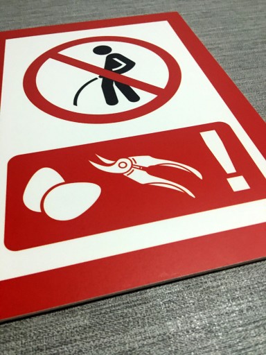 Tabliczka wykonana jest z płyty PCV o grubości 3 mm (tworzywo sztuczne, bardzo trwałe i lekkie) oraz oklejona folią laminowaną dzięki czemu kolory na niej nie bledną z czasem.