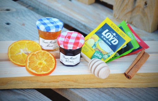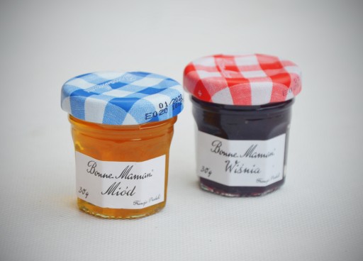 - miód i dżem wiśniowy do herbaty, opakowanie 30 g,