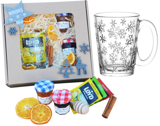 Piękny i praktyczny prezent na Święta Bożego Narodzenia - zestaw na zimowe wieczory - urocza szklanka, pyszna herbata, miód, dżemik, łyżka do miodu. Całość pięknie ozdobiona i zapakowana. Doskonały prezent pod choinkę dla najbliższych, znajomych, szefa, szefowej, wychowawczyni.