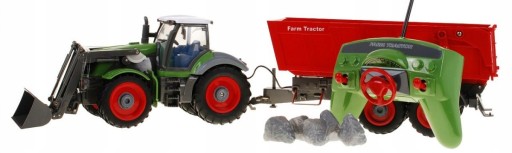 Zdalnie sterowany traktor z przyczepą posiada ergonomicznego pilota, który jest wyposażony w różne funkcje.