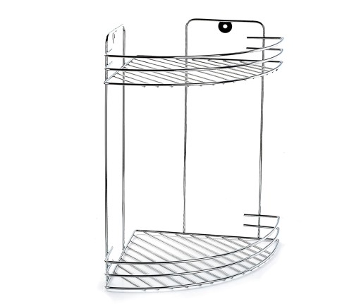 Dwupoziomowa narożna półka łazienkowa wykonana z drutu chromowanego.