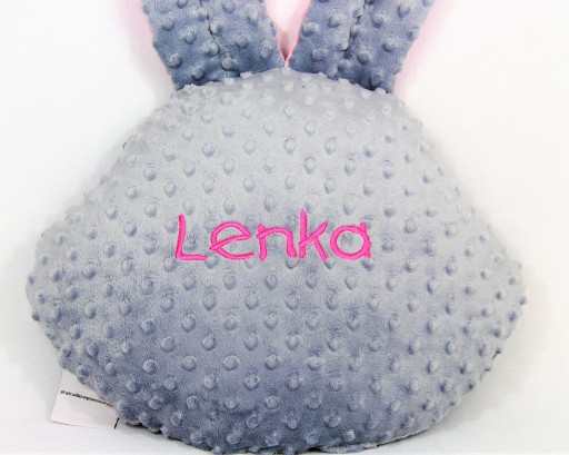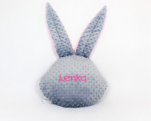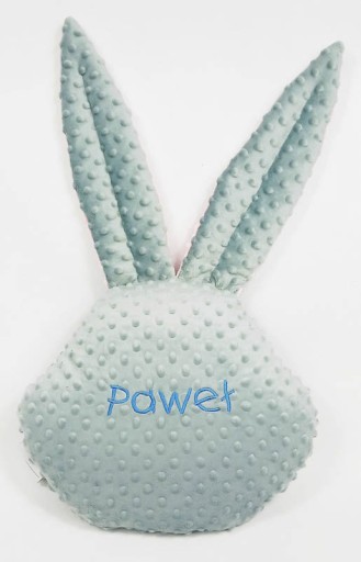 Przedmiotem sprzedaży jest PODUSZKA ZWIERZĄTKO ZAJĄCZEK z różowymi dodatkami(uszka, nosek) z możliwością wyhaftowania krótkiego napisu(dedykacja, imię itp.)