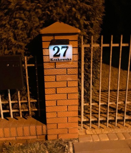 Tabliczka zaopatrzona jest w moduł z baterią słoneczną, więc jest ładnie podświetlona w nocy diodami LED i nie wymaga zasilania przez kabel.
