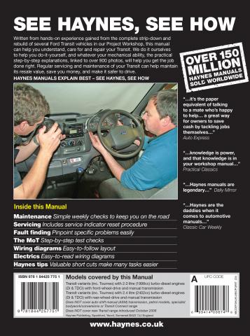 W książce opisano samochód Ford Transit, modele od października 2000 do października 2006 roku, wyposażone w silniki diesla. Poradnik uwzględnia wersje Tourneo z przednim lub tylnym napędem oraz manualną skrzynią biegów.