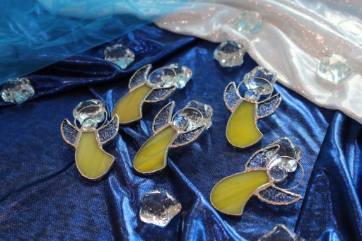 Sukienki aniołków wykonane są z tzw zamkniętego i półzamkniętego szkła witrażowego. Oznacza to że ich barwione w masie kolory przepuszczają światło, ale nie kształty, w związku z tym można je powiesić nie tylko na oknie ale i na ścianie.