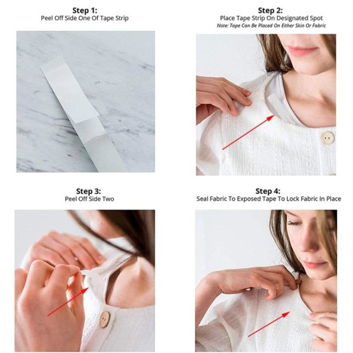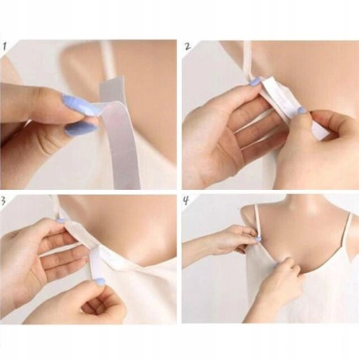 Służy do umocowania na właściwym miejscu odstających lub opadających niesfornie elementów garderoby. Możesz np. podkleić nią sukienkę bez ramiączek, odchylającą się tkaninę na dekolcie, opadające ramiączka bluzeczki... itp. Przylepiasz ją z jednej strony do tkaniny, a drugą stroną do suchej skóry.
