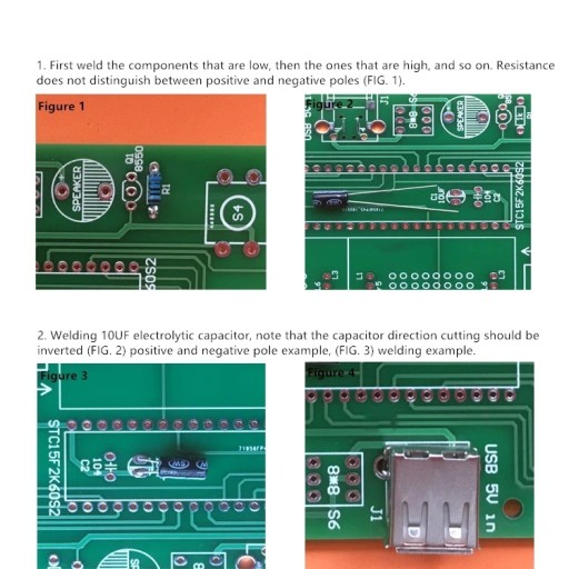 Układy mają nadrukowany schemat montażu na płytce. Trzeba zwrócić uwagę na biegunowość w przypadku takich elementów jak kondensatory, diody, tranzystory. W przypadku diód Led dłuższa nóżka to plus +, większość elementów ma opisane parametry na obudowie. Rezystory mogą mieć oznaczenia paskowe ich oporność oraz tolerancję można odczytać za pomocą kalkulatorów dostępnych w internecie lub mierząc miernikiem. Kolejność montażu zazwyczaj jest dowolna , w zależności od układu, montujemy najpierw najmniejsze elementy.
