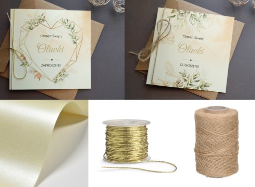 Do zaproszeń dodawany jest złoty sznurek lub sznurek jutowy do własnoręcznego zawiązania
