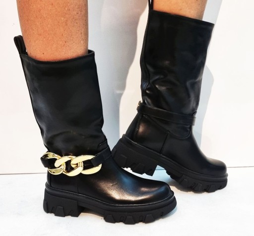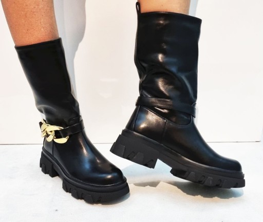 NOWE LUKSUSOWE CZARNE BOTKI TRAPERY ZE ZŁOTYM OZDOBNYM ELEMENTEM
