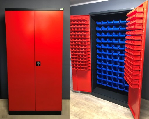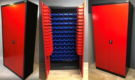 Wszystkie elementy szafy wykonane z blachy stalowej gr.1,0 mm. Drzwi ze schowanymi zawiasami. Uchwyt drzwiowy z zamkiem zabezpieczającym z ryglowaniem w dwóch punktach. Szafa wyposażona w listwy do mocowania pojemników narzędziowych o wymiarach 108 x 144 x 224 /170 mm (72 sztuki) na ścianie tylnej i o wymiarach 56 x 77 x 119 /90 mm (po 80 sztuk) na drzwiach szafy. Szafa dostarczana z pojemnikami.