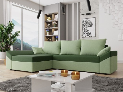 Na wyjątkowy styl narożnika wpływa ciekawy układ podłokietników oraz geometryczna bryła skrzyni i oparcia. Ponadto narożnik możesz ustawić w centralnym miejscu salonu, gdyż jest modelem wolnostojącym. Za aspekty komfortu odpowiadają zastosowane sprężyny faliste, znajdujące się w siedzisku oraz warstwa elastycznej pianki. Natomiast oparcie tworzą duże, ruchome poduszki. Dodatkowo narożnik został wyposażony w funkcję spania oraz pojemnik na pościel. Po rozłożeniu powierzchnia spania wynosi 200 x 130 cm.