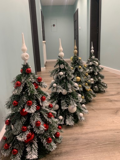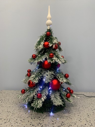 Choinka sztuczna z oświetleniem( do gniazdka zasilania-gratis)- ubrana w bombki i szpic, gotowa do postawienia.
