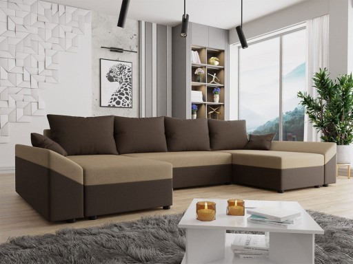 Narożnik do salonu, zaprojektowany na wzór litery „U”. Dzięki swojej konstrukcji oferuje dwie leżanki, które uprzyjemnią wieczorny wypoczynek oraz rodzinne oglądanie telewizji. Ciekawym akcentem prezentowanego narożnika są podłokietniki ułożone pod kątem – sprawiają, że przedstawiany model nabiera nowoczesnego charakteru. Wybierając narożnik z pewnością docenisz komfort użytkowania. W oparciu znajdują się ruchome, duże poduszki, które umożliwią odprężenie karku po ciężkim dniu. Natomiast w siedzisku zostały zastosowane sprężyny faliste oraz warstwa elastycznej pianki. Warto również podkreślić funkcję spania, którą oferuje model. Po rozłożeniu powierzchnia spania wynosi 268 cm x 130 cm. Natomiast komplet zapasowej pościeli przechowasz w pojemniku, który mieści się w skrzyni mebla.