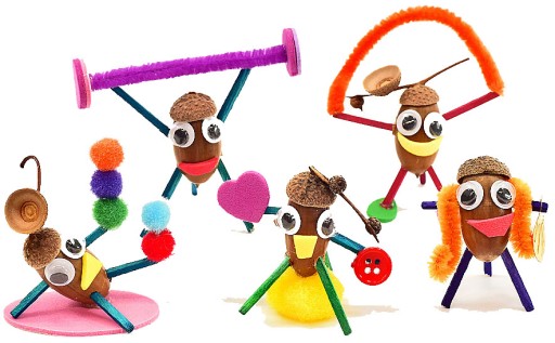 Poniżej przedstawiamy przykładowe prace stworzone z zestawu. Do wykonania pracy poza elementami zestawu użyliśmy: zużyte kartonowe pudełko, żołędzie, tubkę z papieru toaletowego, kartki papieru oraz malutką dynię (jakikolwiek produkt który można obkleić guziczkami ;-). Wszystkie te produkty dziecko znajdzie w domu ;).