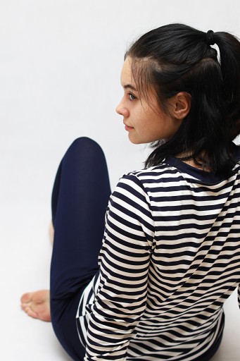 Koszulka w paski, o luźnym kroju, dłuższa, pod szyjką, rękawy oraz dól wykończone ściągaczami w kolorze spodni.