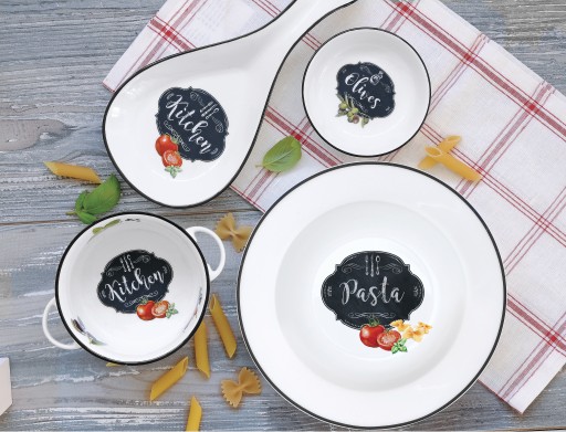 Miseczka jest ozdobiona motywem czosnku i listków bazylii, pomidorków, papryczek i pieprzu, oraz oliwek.