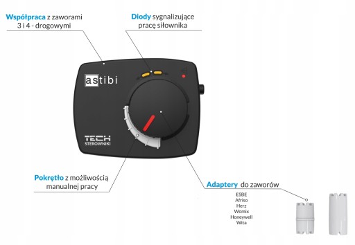 - Siłownik w zestawie posiada adaptery i śruby mocujące do zaworów takich firm jak: ESBE, Afriso, Herz, Womix, Honeywell, Wita.