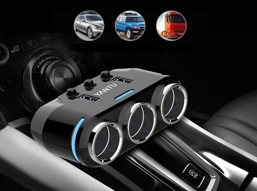 Rozdzielacz na trzy gniazda zapalniczki z cyfrowym woltomierzem wyświetlającym aktualny poziom napięcia akumulatora i dwoma portami USB szybkiego łądowania. Zestaw umożliwia jednoczesne korzystanie ze wszystkich gniazd, czyli ładowanie np. nawigacji i telefonu w tym samym czasie. Każde gniazdo zapalniczki podsiada osobny włącznik / wyłącznik i jest podświetlone na niebiesko diodami LED. Rozdzielacz wyposażony jest w ochronę przed zwarciem, przegrzaniem oraz ochronę przed zbyt dużym napięciem.